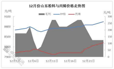 12月份丙烯市場表現(xiàn)強勢,價格重心上移,截至12月25日,山東丙烯市場價格漲至8300-8350元/噸,月均價在8076元/噸,環(huán)比11月份上漲2.5%。本月丙烯市場主要是受到了供需面共同的利好影響,從而推動了價格的上漲。