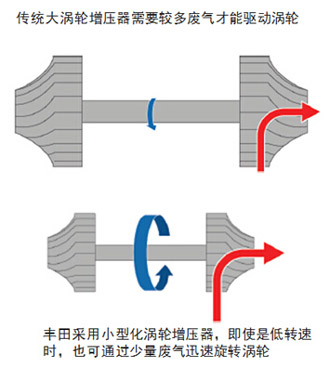 豐田通過渦輪小型化非常巧妙地解決了這個(gè)難題,同樣排量的發(fā)動機(jī),豐田采用了體積更小、重量更輕的渦輪,使得只需很少廢氣就可以啟動渦輪,只要你加油,渦輪就啟動。