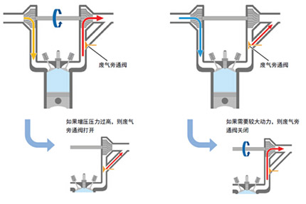 豐田渦輪增壓的廢氣旁通閥門正常情況下處于開啟狀態(tài),排氣直接通過閥門排放,并不推動渦輪,只有在加速或爬坡等需要較大動力時(shí),閥門才會關(guān)閉,廢氣推動渦輪做功。