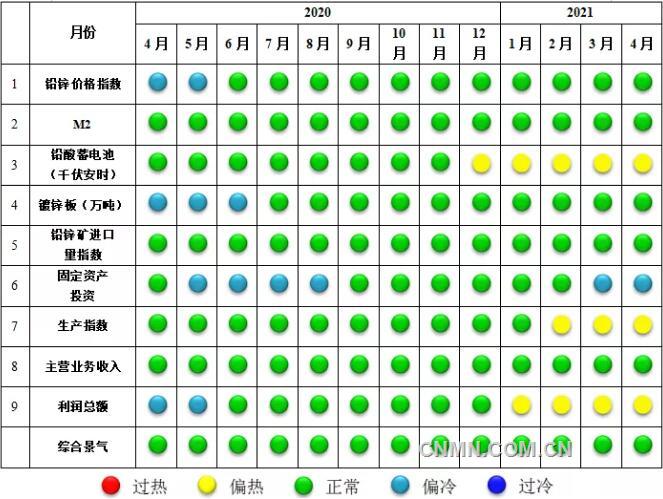 2021年4月,在構(gòu)成中國鉛鋅產(chǎn)業(yè)月度景氣指數(shù)的9個(gè)指標(biāo)中,鉛酸蓄電池、生產(chǎn)指數(shù)和利潤總額3個(gè)指標(biāo)位于“偏熱”區(qū)間運(yùn)行。鉛鋅價(jià)格指數(shù)、M2、鍍鋅板、鉛鋅礦進(jìn)口量和主營業(yè)務(wù)收入5個(gè)指標(biāo)位于“正?!眳^(qū)間運(yùn)行;固定資產(chǎn)投資1個(gè)指標(biāo)位于“偏冷”區(qū)間運(yùn)行。中國鉛鋅產(chǎn)業(yè)月度景氣信號燈如圖2所示。