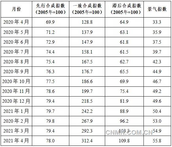 表1 2020年4月至2021年4月中國鉛鋅產(chǎn)業(yè)月度景氣指數(shù)