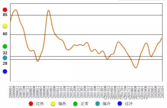 2021年4月,中國鉛鋅產(chǎn)業(yè)月度景氣指數(shù)持續(xù)回升,較上月上升0.9個(gè)點(diǎn)至55.8,位于“正?!眳^(qū)間上部運(yùn)行。中國鉛鋅產(chǎn)業(yè)月度景氣指數(shù)運(yùn)行趨勢如圖1所示。