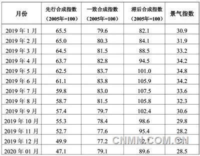 中色鋁冶煉產(chǎn)業(yè)景氣指數(shù)監(jiān)測(cè)結(jié)果顯示,2020年1月,景氣指數(shù)為28.5,環(huán)比上升1.4點(diǎn);先行合成指數(shù)為47.1,環(huán)比回落2.8點(diǎn)。近13個(gè)月,中色鋁冶煉產(chǎn)業(yè)景氣指數(shù)見(jiàn)表1。模型監(jiān)測(cè)結(jié)果顯示,1月份鋁冶煉行業(yè)延續(xù)上月走勢(shì),仍處“偏冷”區(qū)間,與此同時(shí)先行合成指數(shù)延續(xù)回落態(tài)勢(shì),加之疫情對(duì)經(jīng)濟(jì)及行業(yè)的負(fù)面影響尚未體現(xiàn)在1月份模型中,可見(jiàn)行業(yè)景氣度回暖壓力猶存。