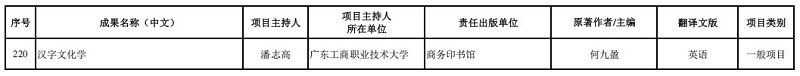 12月23日,全國哲學社會科學工作辦公室公布了2025年國家社會科學基金中華學術(shù)外譯項目立項名單,共計255項。廣東工商職業(yè)技術(shù)大學外國語學院院長潘志高教授主持申報的《漢字文化學》成功獲批立項。這是該校首次獲批國家社會科學基金中華學術(shù)外譯項目,實現(xiàn)了學校在此類項目上“零的突破”,也是目前全國唯一一所獲批中華學術(shù)外譯項目立項的職業(yè)本科院校,標志著該校哲學社會科學研究的國際化水平和學術(shù)傳播能力邁上了新臺階。