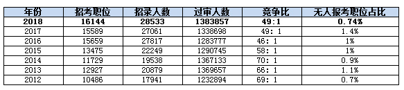 再次從無(wú)人報(bào)考職位來(lái)看,共有119個(gè)職位無(wú)人報(bào)考,占0.74%,比去年降低了一半。而從近7年的數(shù)據(jù)來(lái)看,除了2012年為0.7%,其余年份都比今年高,也可以看出考生報(bào)名更加向著均衡化發(fā)展。