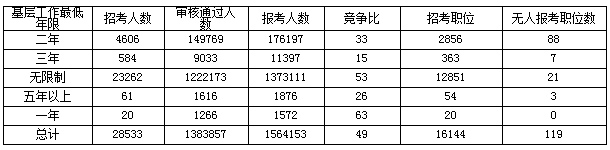 其次從平均競(jìng)爭(zhēng)比來(lái)看,目前平均競(jìng)爭(zhēng)比49:1,與去年持平,而從近7年數(shù)據(jù)來(lái)看,這并不是最高的,相對(duì)于2014年的70:1低了很多。2015年以來(lái),國(guó)考競(jìng)爭(zhēng)比降低了很多,凸顯了考生報(bào)名的理性化。
