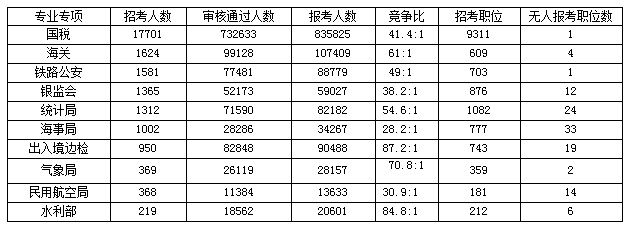 國(guó)稅是招錄大戶(hù),共有73萬(wàn)人通過(guò)審核,仍有10萬(wàn)人待審中,無(wú)人報(bào)考職位僅剩1個(gè)。海關(guān)審核通過(guò)人數(shù)位居第二,有9.9萬(wàn)人通過(guò)審核,競(jìng)爭(zhēng)比為61:1。水利部競(jìng)爭(zhēng)比最高,為85:1。國(guó)稅、海關(guān)、鐵路公安、銀監(jiān)會(huì)、統(tǒng)計(jì)局、海事局、出入境邊檢、氣象局、民航、水利部是國(guó)考招錄大戶(hù),也是考生報(bào)考的重點(diǎn),競(jìng)爭(zhēng)壓力都不小