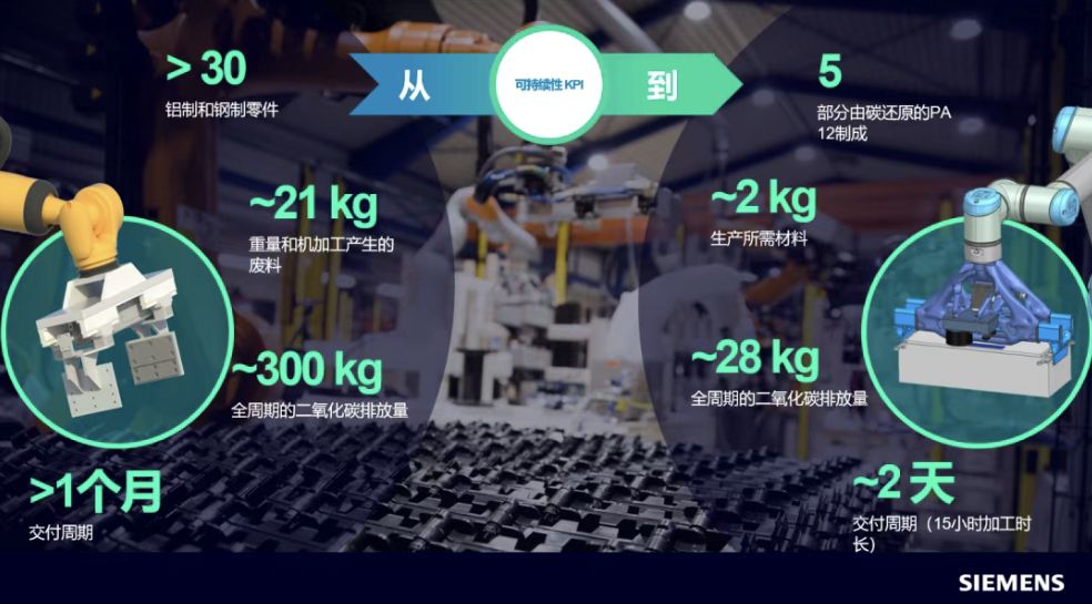 更重要的是,這款夾具的生產(chǎn)顯著降低了環(huán)境影響:采用減碳型FDM extreme MK3S+材料,碳足跡從300千克降至僅28千克;原材料從21kg減少到2kg,交付周期從1個月到2天,能耗和維護成本節(jié)約超過50%,實現(xiàn)了成本與環(huán)保的雙重提升。加之高度集成與智能制造軟件支持,西門子打造出一款高效、綠色且易維護的工業(yè)末端夾具,代表了未來智能制造的方向。