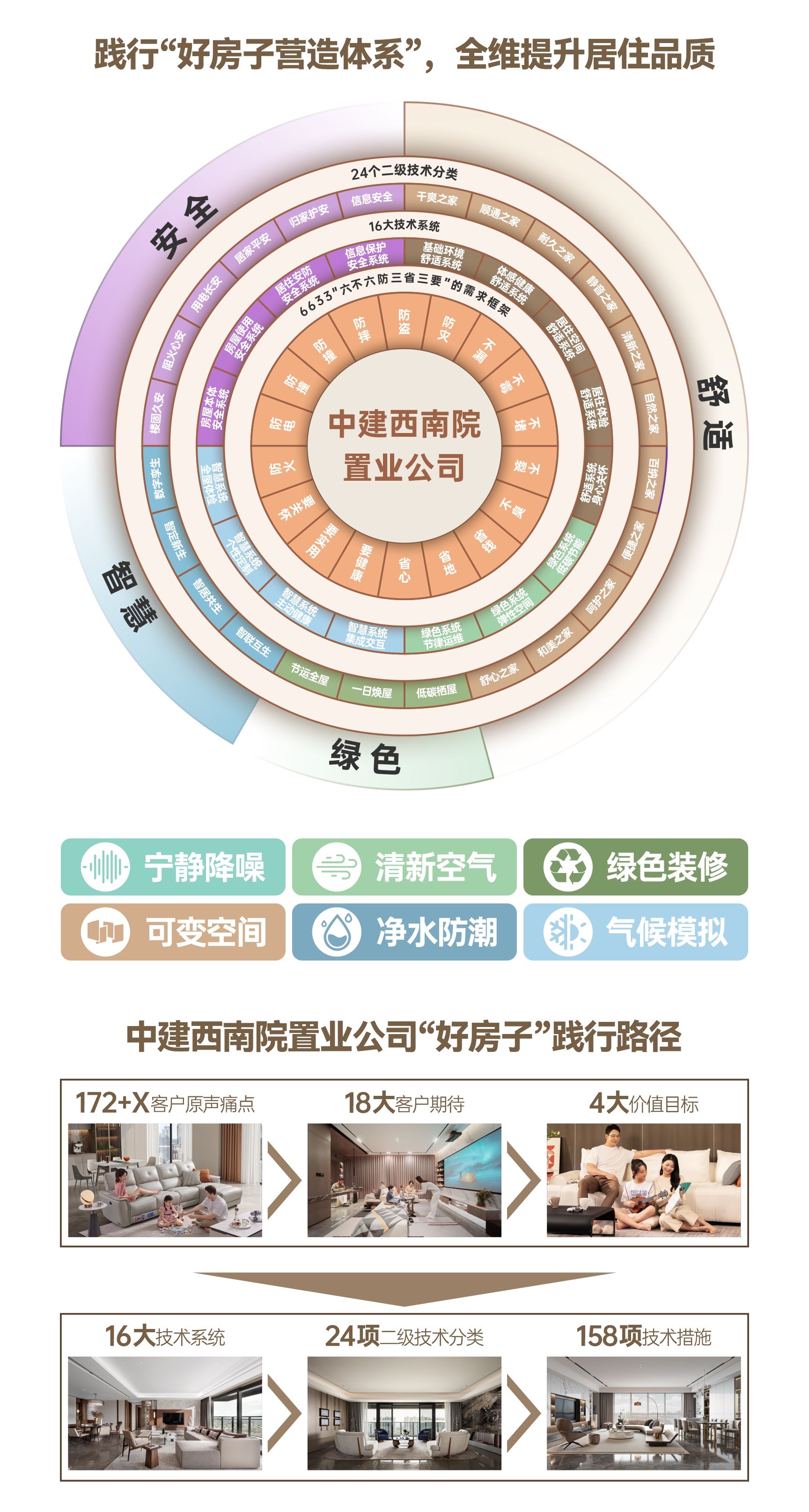 從2025年《政府工作報告》明確提出適應(yīng)人民群眾高品質(zhì)居住需要,完善標(biāo)準(zhǔn)規(guī)范,推動建設(shè)“安全、舒適、綠色、智慧”的“好房子”,到中國建筑統(tǒng)籌“好標(biāo)準(zhǔn)、好設(shè)計、好材料、好建造、好服務(wù)”,通過“五好集成”的“好房子”體系部署,再到四川省地方性評價標(biāo)準(zhǔn)出臺,政策與標(biāo)準(zhǔn)層層遞進(jìn)推動高品質(zhì)住房規(guī)范化發(fā)展。作為《四川省好住房設(shè)計導(dǎo)則》《成都市好住房設(shè)計導(dǎo)則(試行)》主編單位,中建西南院以“六不六防三省三要”(下稱“6633”)需求框架為核心,系統(tǒng)采集在地居民居住痛點(diǎn),針對敏感點(diǎn)進(jìn)行分級、排序,同時整合技術(shù)力量,形成16大技術(shù)系統(tǒng)、24個二級技術(shù)分類,精準(zhǔn)響應(yīng)158條客戶原聲需求,讓“好房子”回歸“好好住”本質(zhì)。