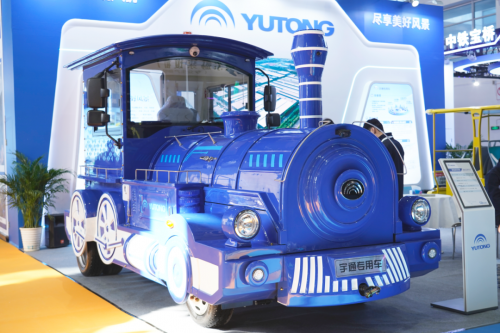 在展區(qū)中央,復(fù)古風(fēng)格的觀光小火車成為焦點(diǎn)。藍(lán)白配色的車廂、仿蒸汽機(jī)車頭設(shè)計(jì),搭配LED氛圍燈帶,瞬間將人拉入童話世界。作為宇通觀光車家族中的“王牌”產(chǎn)品,它不僅延續(xù)了品牌“高安全、高可靠”的產(chǎn)品基因,更以長續(xù)航、強(qiáng)動力、高舒適度,重新定義景區(qū)“第三空間”,贏得眾多客戶贊譽(yù)。