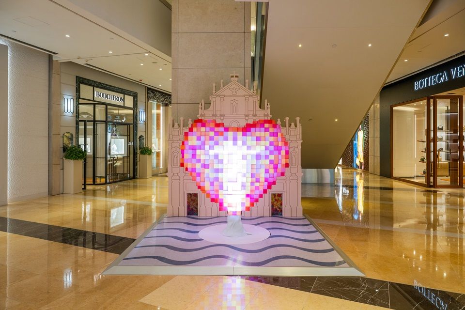 商場地面層的“心系澳門”裝置由一個巨型紅色愛心和仿大三巴牌坊的背景組成。這件作品透過將色彩繽紛的愛心與澳門最具代表性的歷史地標并置,展現澳門作為一個多元文化城市的雙重魅力,象征著中葡和東西方文化的和諧共存。
