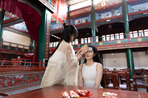 古北水鎮(zhèn)設(shè)置點(diǎn)額、系五彩繩、撒雄黃酒、做香囊等傳統(tǒng)習(xí)俗體驗(yàn)點(diǎn),將端午習(xí)俗解構(gòu)為可感知、可參與的沉浸式體驗(yàn)單元。點(diǎn)額禮體驗(yàn)區(qū)以雄黃酒為媒,執(zhí)筆蘸雄黃,在孩童眉心輕輕點(diǎn)畫(huà);系上象征五色祥瑞的五彩繩,將五彩繩轉(zhuǎn)化為親子記憶載體;游客以艾草蘸雄黃酒,撒雄黃酒祛穢祈順;香囊DIY體驗(yàn)區(qū)清香縈繞,游客將草藥親手縫入香囊,佩戴在身邊。這些傳統(tǒng)習(xí)俗體驗(yàn)點(diǎn)通過(guò)“五感通聯(lián)”設(shè)計(jì)強(qiáng)化儀式感染力,以場(chǎng)景化互動(dòng)傳遞端午文化的深厚底蘊(yùn),以儀式感構(gòu)建文化傳承的沉浸場(chǎng)域。