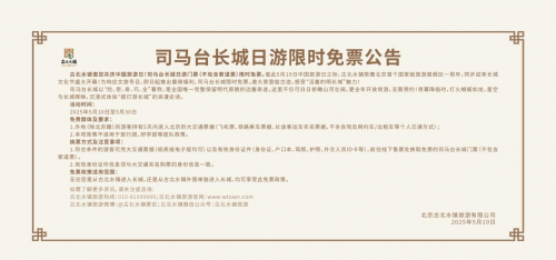 2025年5月10日-5月30日期間,司馬臺(tái)長(zhǎng)城日游面向外地游客免票,持5日內(nèi)進(jìn)京大交通票據(jù)即可兌換長(zhǎng)城日游免費(fèi)門(mén)票(不含索道)。雙重福利疊加,為家庭出游提供高性價(jià)比選擇,激活文旅消費(fèi)新動(dòng)能。