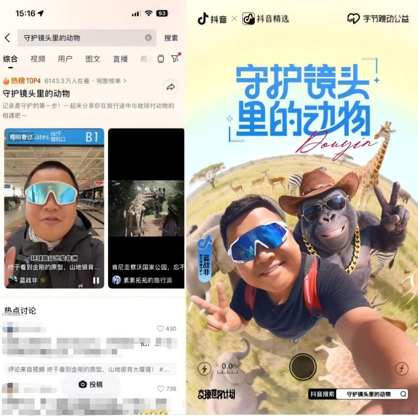 在抖音“創(chuàng)作階梯計劃”支持下,藍戰(zhàn)非的公益行動還帶動了40多位跨領域創(chuàng)作者共創(chuàng),通過多元視角記錄世界各地的動物故事,讓“守護野生動物”從個體發(fā)聲升級為跨地域、跨圈層的集體行動。他的視頻摒棄說教式表達,以真實體驗和樸素情感引發(fā)觀眾共情,在斯里蘭卡搜尋藍鯨未果時呼吁“保護海洋”,在非洲草原相遇野生動物時傳遞“謙卑路過另一個生命世界”的理念,讓正能量內(nèi)容獲得更廣泛的傳播穿透力。