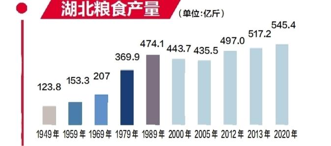 從1949年至2020年,湖北年均糧食總產(chǎn)從123.8億斤躍升至545.4億斤,翻了兩番以上,71年累計(jì)產(chǎn)糧2.6萬(wàn)億斤,為端牢“中國(guó)飯碗”作出了巨大貢獻(xiàn)。