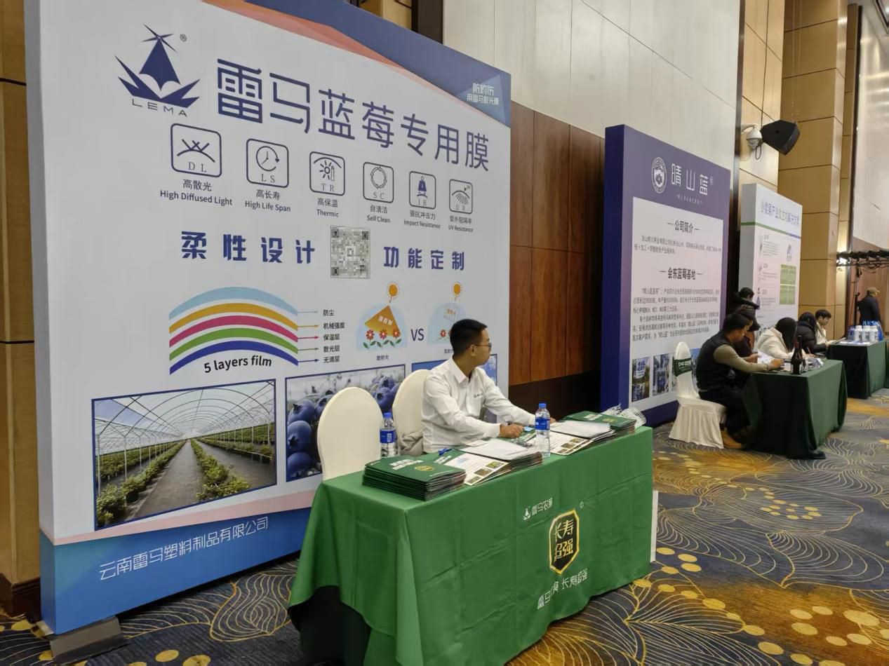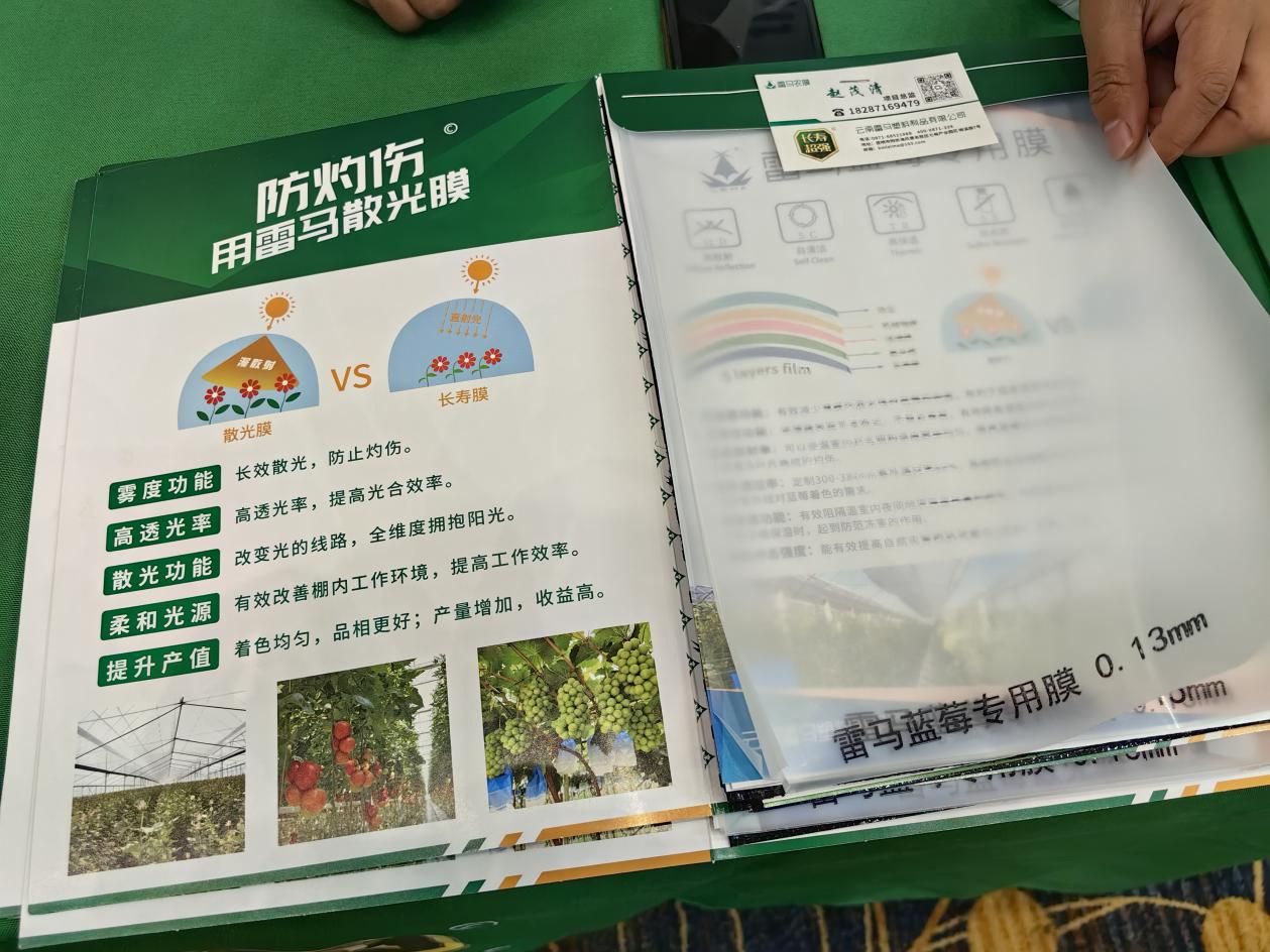 此次博覽會(huì)的主題集中在高原藍(lán)莓種植上,在高海拔、強(qiáng)光照的“天賦”背后,高原種植特有的“甜蜜負(fù)擔(dān)”——果實(shí)灼傷問題,也引發(fā)了產(chǎn)業(yè)鏈各環(huán)節(jié)的深度思考。位于B10展位的云南雷馬塑料制品有限公司,以其創(chuàng)新研發(fā)的“防灼傷?散光膜”系列產(chǎn)品,為這一痛點(diǎn)提供了科技解決方案,展現(xiàn)了設(shè)施農(nóng)業(yè)覆蓋材料在賦能產(chǎn)業(yè)升級(jí)中的關(guān)鍵力量。
