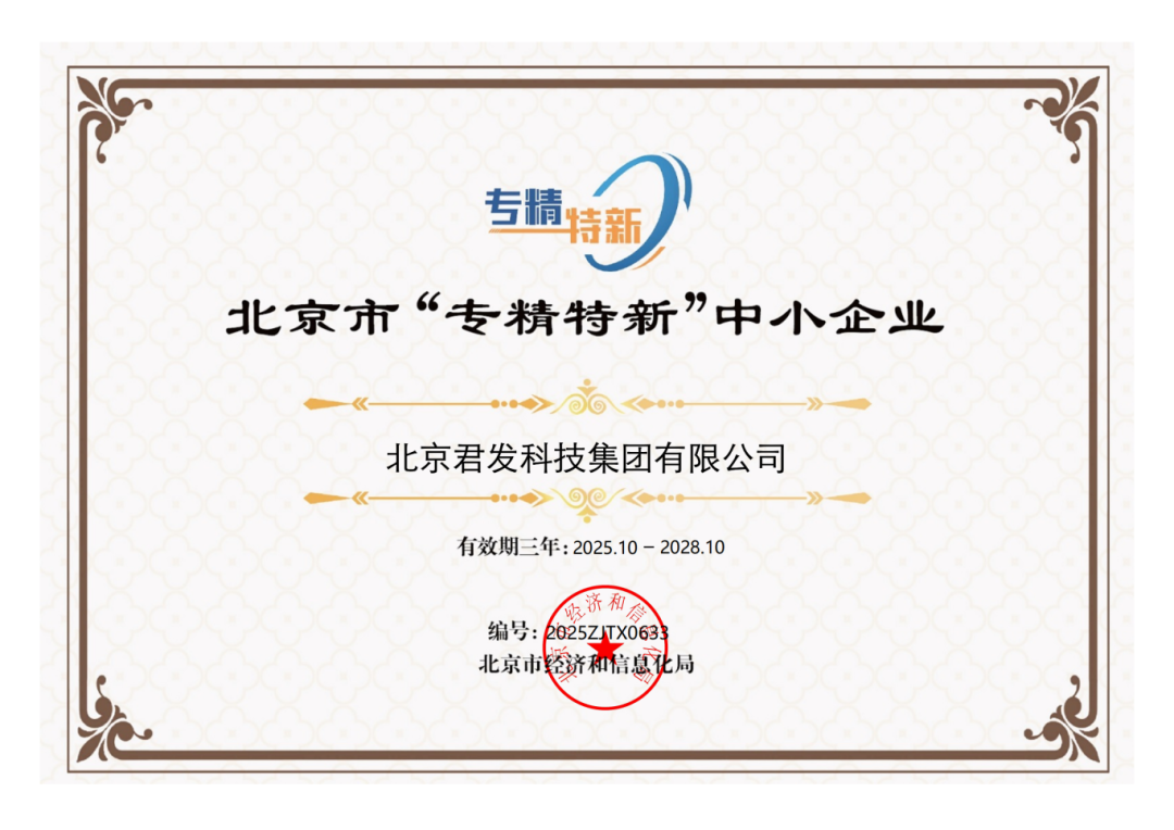 10月16日,北京市經(jīng)濟(jì)與信息化局公布2025年第二季度“專精特新”中小企業(yè)認(rèn)定名單,北京君發(fā)科技集團(tuán)有限公司榮獲認(rèn)證,標(biāo)志著其在技術(shù)創(chuàng)新與專業(yè)化發(fā)展方面贏得了官方認(rèn)可。