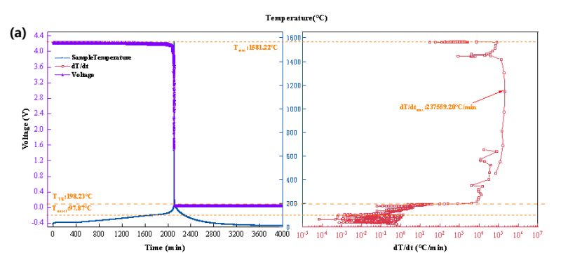 圖2 三元九系電池?zé)崾Э?a)溫度&電壓-時間曲線、溫升速率-溫度曲線和(b)附加熱電偶溫度-時間曲線