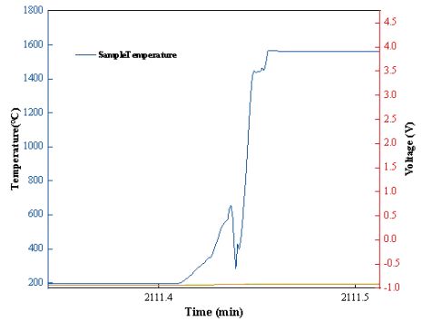 對圖2溫度數(shù)據(jù)及圖3產(chǎn)氣速率、產(chǎn)氣量數(shù)據(jù)進行分析后發(fā)現(xiàn),該電池?zé)崾Э厥謩×?,并且放大樣品溫度曲線可以發(fā)現(xiàn),整個熱失控過程從開始到結(jié)束持續(xù)不到3s,就完成了1300℃以上的溫升,溫升速率達到了200000℃/min以上。同時,觀察氣體數(shù)據(jù)可以發(fā)現(xiàn),在熱失控過程中最大產(chǎn)氣速率達到15000L/min以上,展現(xiàn)了鋰電池燃爆時極強的沖擊力。