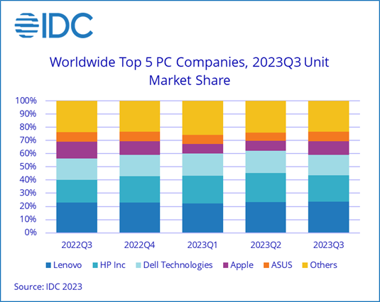 兩份報(bào)告中還顯示,蘋果的出貨量下滑最嚴(yán)重,同比下降24%,在在主要個(gè)人電腦生產(chǎn)商中跌幅最大;惠普的出貨量增長(zhǎng)6.4%,是第三季度唯一實(shí)現(xiàn)增長(zhǎng)的廠商。聯(lián)想以25%的全球市場(chǎng)份額保持了第一的位置。