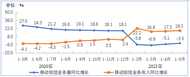 2020-2021年1-5月移動短信業(yè)務量和收入同比增長情況