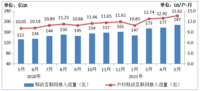 2020-2021年5月移動互聯(lián)網(wǎng)接入月流量及戶均流量(DOU)情況