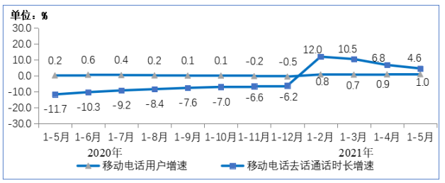 2020-2021年1-5月移動電話用戶增速和通話時長增速