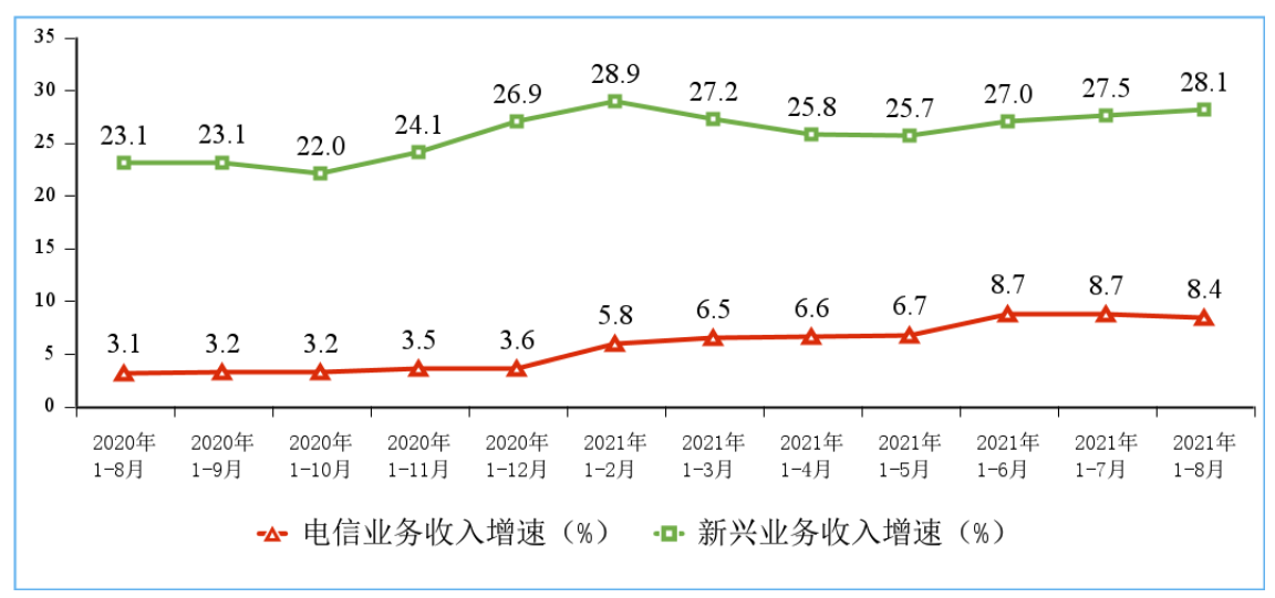2020-2021年1-8月份電信業(yè)務(wù)收入分類(lèi)增長(zhǎng)情況