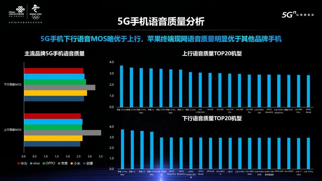 5G手機(jī)語音質(zhì)量分析數(shù)據(jù)顯示,5G手機(jī)下行MOS略優(yōu)于上行,蘋果終端現(xiàn)網(wǎng)語音質(zhì)量明顯優(yōu)于其他品牌手機(jī)。