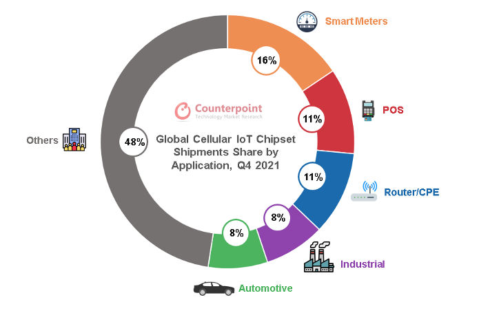 2021年第四季度全球蜂窩物聯(lián)網(wǎng)芯片出貨量份額(按應(yīng)用劃分)