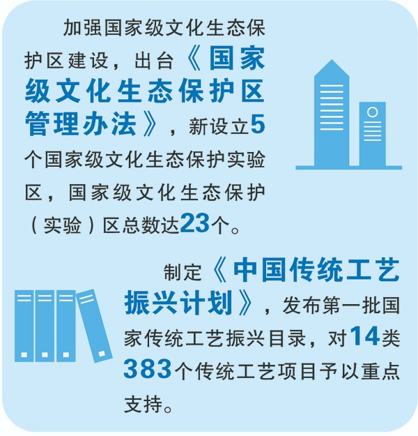 加快修訂文物保護(hù)法?;I備召開革命文物保護(hù)工作會(huì)議。推動(dòng)印發(fā)讓文物活起來、擴(kuò)大中華文化國際影響力的政策文件。深入實(shí)施中華文明探源、考古中國、中華文化資源普查等工程。嚴(yán)厲打擊文物犯罪。推進(jìn)博物館改革發(fā)展,加強(qiáng)智慧博物館建設(shè)。實(shí)施好古籍保護(hù)工程。完成第五批國家級(jí)非遺代表性項(xiàng)目、啟動(dòng)第六批國家級(jí)非遺代表性傳承人認(rèn)定工作。加強(qiáng)國家級(jí)非遺代表性項(xiàng)目和代表性傳承人的評(píng)估與管理。繼續(xù)實(shí)施非遺傳承人群研修研習(xí)培訓(xùn)計(jì)劃、非遺記錄工程、中國傳統(tǒng)工藝振興計(jì)劃、曲藝傳承發(fā)展計(jì)劃。推進(jìn)國家級(jí)文化生態(tài)保護(hù)區(qū)建設(shè)。辦好“文化和自然遺產(chǎn)日”、成都國際非遺節(jié)、非遺購物節(jié)、中國傳統(tǒng)工藝邀請(qǐng)展、中國原生民歌節(jié)等活動(dòng)。