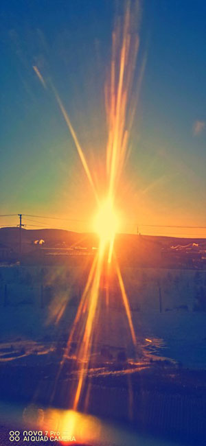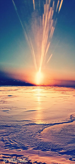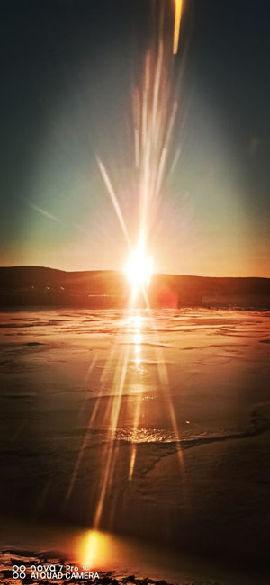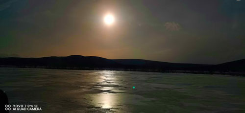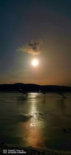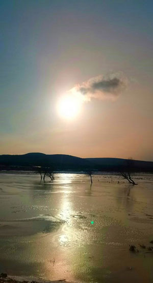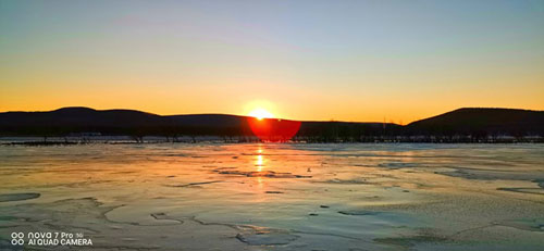 一道殘陽鋪水中,半江瑟瑟半江紅。冰與火,在漸離漸遠的不舍中,碰撞出燦爛耀眼的光芒。火樹銀花般綻放的璀璨,讓冰河有了大海的氣勢,而冰河的冷艷,讓如血的殘陽,美到極致。