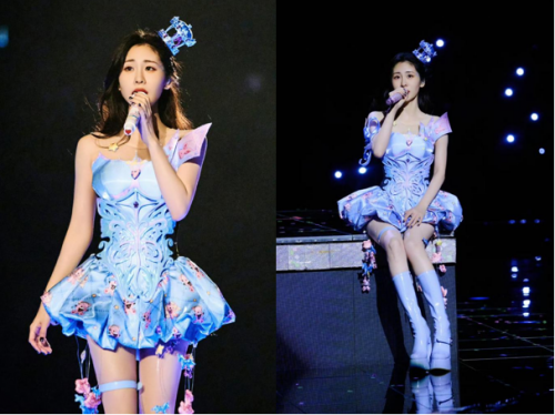 張碧晨演唱會定制藍色寶石蝴蝶胸衣及王冠頭飾:采用精密金屬雕刻與藍寶石鑲嵌,既展現(xiàn)優(yōu)雅氣質(zhì),又賦予舞臺造型夢幻般的視覺張力。