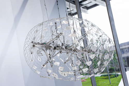 趙瀟瀟,《云圖》,2022,鋁、電子元件、碳纖維桿。晉城“古建新語”當代藝術展——“斗轉星移”藝術家群展展覽現(xiàn)場,晉城城市體驗中心,2025。圖片由UCCA Lab提供。