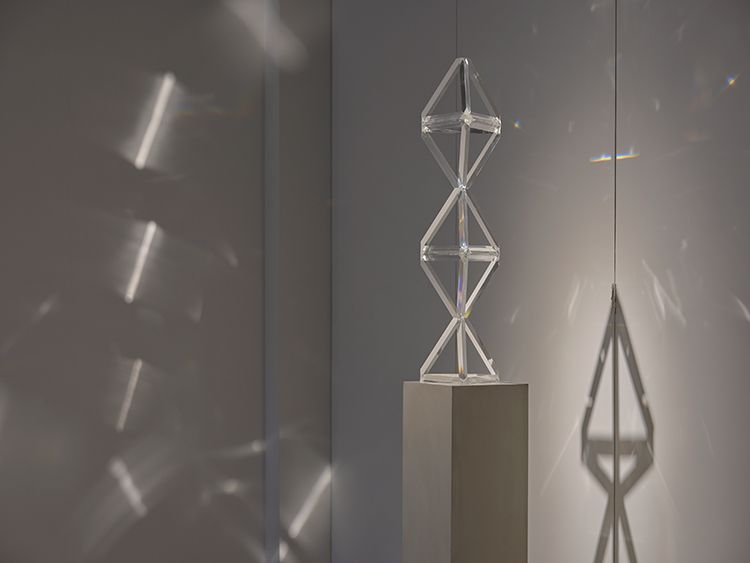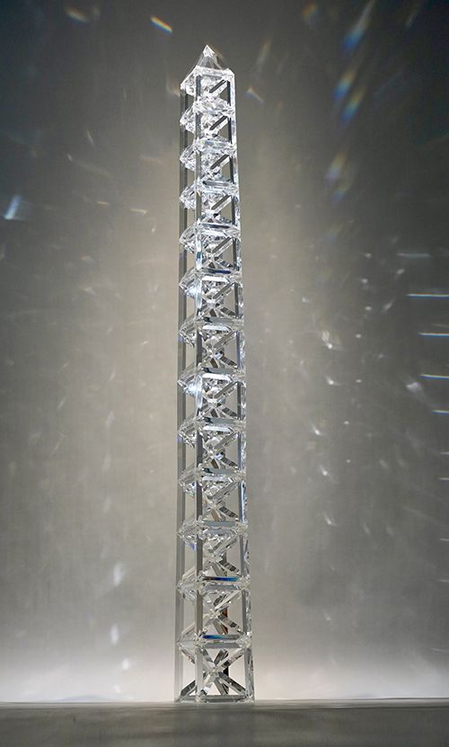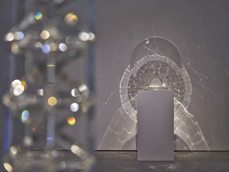 在《映》系列中,蔡志松展現(xiàn)了從宏大敘事向精微內(nèi)觀(guān)的形式蛻變,作品呈現(xiàn)出兩種相輔相成的面向:比如作品 《天際》,那座11層鏤空的錐形水晶塔,以其層層遞進(jìn)、指向“天際”的尖銳結(jié)構(gòu),在“簡(jiǎn)潔利落的幾何感”中,蘊(yùn)含著一種理性的秩序與精神的向上感。它通體“通透”,卻又能在燈光下迸發(fā)出“填滿(mǎn)整個(gè)空間的絢爛光彩”。這完美詮釋了藝術(shù)家所追求的“堅(jiān)實(shí)卻輕盈,允許一切穿過(guò),又自有璀璨光華”的生命狀態(tài)。它既是物質(zhì)的塔,更是精神的塔,象徵著在歷經(jīng)層層修煉與提純後,內(nèi)心所能達(dá)到的既澄澈又光芒四射的境界。