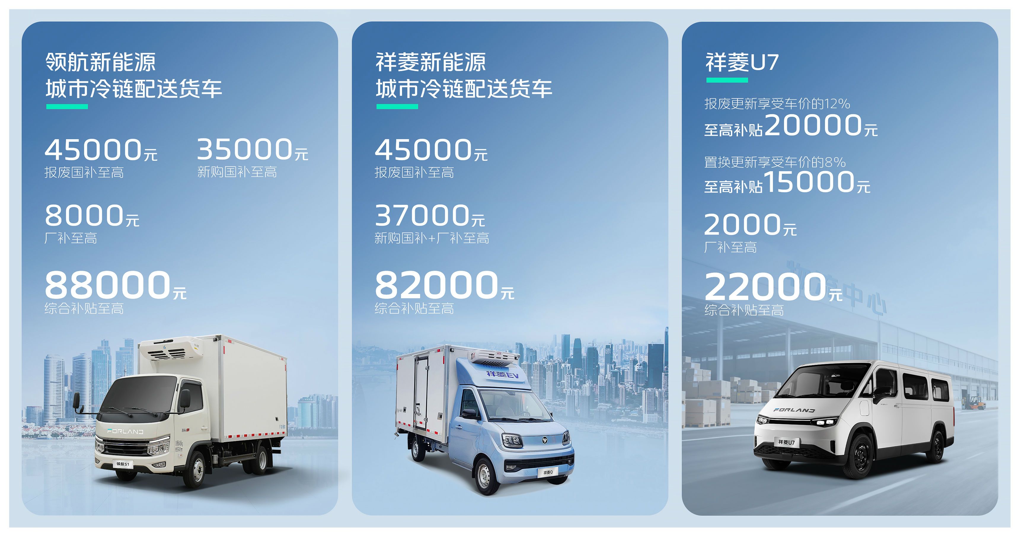 新能源系列補(bǔ)貼精準(zhǔn)落地,領(lǐng)航新能源城市冷鏈配送貨車,報(bào)廢國(guó)補(bǔ)至高45000元,新購(gòu)國(guó)補(bǔ)至高35000元,廠補(bǔ)至高8000元,綜合補(bǔ)貼至高88000元;祥菱新能源城市冷鏈配送貨車,報(bào)廢國(guó)補(bǔ)至高45000元,新購(gòu)國(guó)補(bǔ)+廠補(bǔ)至高37000元,綜合補(bǔ)貼至高82000元;祥菱U7,報(bào)廢更新至高享受車價(jià)的12%(至高補(bǔ)貼2萬(wàn)元),置換更新享受車價(jià)的8%(至高1.5萬(wàn)元),廠補(bǔ)至高2000元,綜合補(bǔ)貼至高22000元,全面滿足不同新能源用戶的煥新需求。