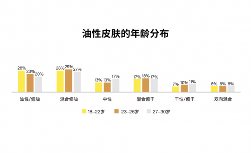 從全方位油性皮膚特征洞察上,它指出了“年齡和地域如何影響油皮的發(fā)生”、“油皮的困惑:生活化判斷標(biāo)準(zhǔn)參差不齊”、“始于出油,不止控油:油皮護(hù)膚的多場景挑戰(zhàn)”、“油皮并不‘扛造’:問題油皮的判定與發(fā)生”等痛點(diǎn)。