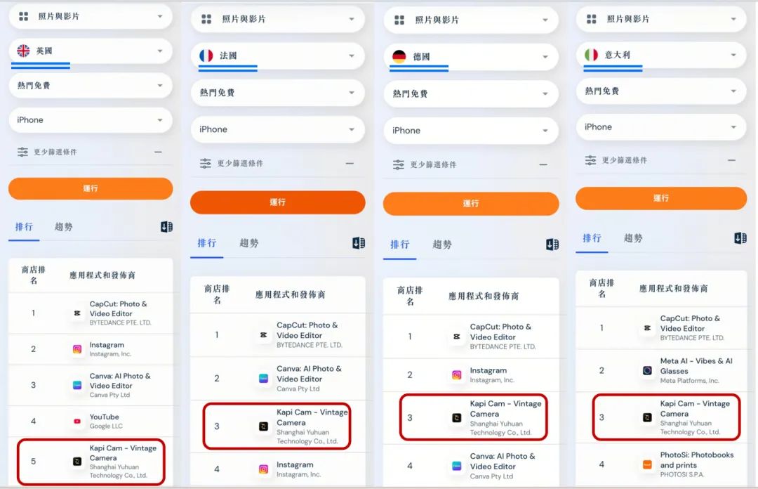 隨后在歐洲,Kapi相機(jī)的熱度迅速蔓延,在英國(guó)、意大利、法國(guó)、德國(guó)等國(guó)的App Store“照片與視頻”應(yīng)用排行榜中,近期均成功躋身前五名。