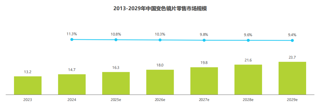 根據(jù)艾瑞咨詢測算,2024年中國變色鏡片零售市場規(guī)模約14.7億元,約占整體鏡片市場的3.6%。2029年將增長擴容至23.7億元,2024~2029年年均復合年增長率約10%左右,高于整體市場表現(xiàn),呈現(xiàn)穩(wěn)定擴容之勢。