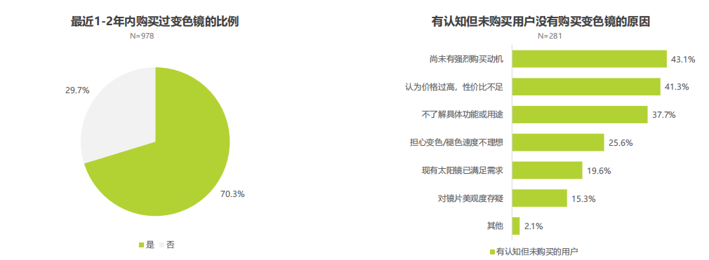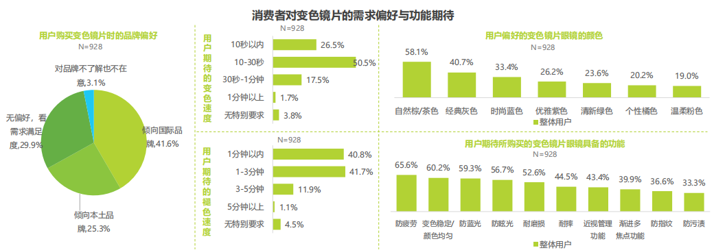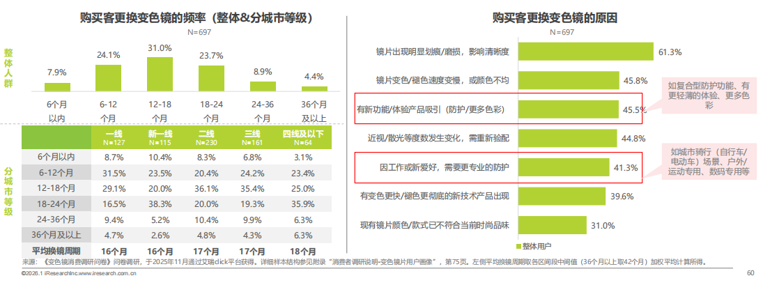 在消費行為上,變色鏡片用戶平均每16個月更換1次鏡片,主流更換周期為12~18個月。新功能/體驗吸引力(45.5%)與新場景需求(41.3%)占重要比例。