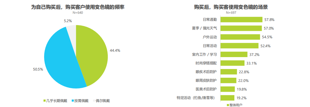 白皮書調(diào)研顯示,已購買變色鏡片的用戶呈現(xiàn)出高粘性特征:約44.4%的用戶幾乎長期配戴,約50.5%按需配戴。日常通勤、夏季強光、戶外運動是其三大高頻使用場景。這意味著,一旦用戶體驗到其便利性,變色鏡片便從功能備選真正轉(zhuǎn)變?yōu)槿粘1貍洹?/p>
