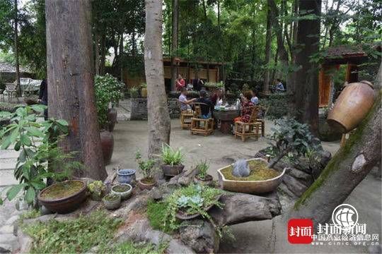 步入豬圈咖啡廳,首先映入眼簾的便是林木深深的川西林盤聚落,筆直茂盛的林木撐起一片綠蔭天空。茂林樹下,來自四面八方的游客在此品一杯川西蓋碗茶,偷得一份浮世清閑。