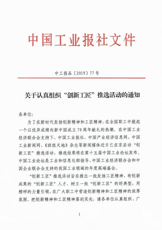 關(guān)于認(rèn)真組織“創(chuàng)新工匠”推選活動(dòng)的通知