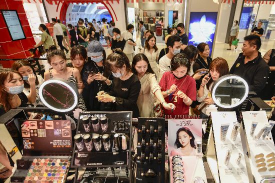 10月4日,消費(fèi)者在海口日月廣場(chǎng)免稅店選購商品。新華社記者蒲曉旭攝