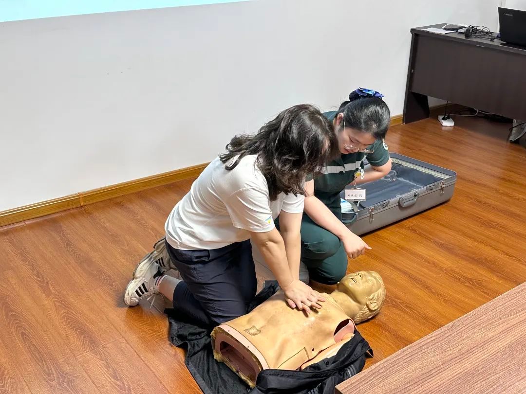 活動(dòng)體驗(yàn)環(huán)節(jié),急救科護(hù)士劉美茹現(xiàn)場(chǎng)演示心肺復(fù)蘇的標(biāo)準(zhǔn)操作流程,并邀請(qǐng)職工分組進(jìn)行實(shí)操訓(xùn)練,手把手糾正按壓姿勢(shì)、力度等細(xì)節(jié)。