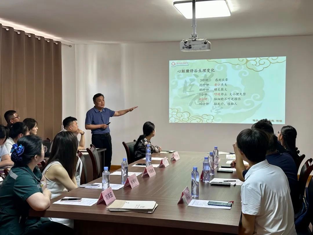 中醫(yī)院急診科主任周立祥現(xiàn)場(chǎng)為職工們講解了心肺復(fù)蘇急救法。他從理論基礎(chǔ)到實(shí)際操作的步驟,認(rèn)真細(xì)致地教給現(xiàn)場(chǎng)人員,強(qiáng)調(diào)了心臟驟停后實(shí)施心肺復(fù)蘇的緊迫性和重要性。