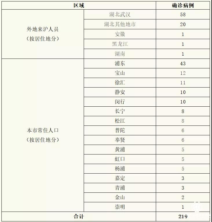 截至2月4日12時(shí),上海市已累計(jì)排除疑似病例527例,發(fā)現(xiàn)確診病例219例。確診病例中,男性112例,女性107例;年齡最大88歲,最小7月齡;121例有湖北居住或旅行史,8例有湖北以外地區(qū)居住或旅行史,90例有相關(guān)病例接觸史;外地來(lái)滬人員81例,本市常住人口138例。具體情況如下: