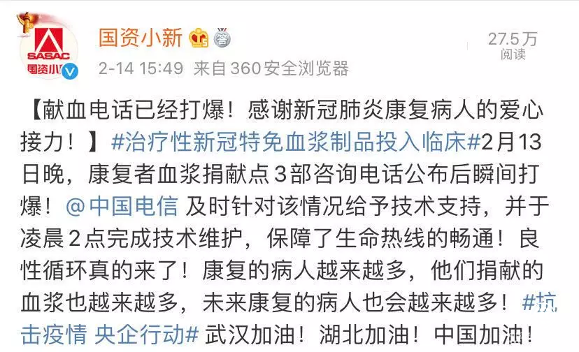 近兩日,全國(guó)各地不斷傳來康復(fù)患者主動(dòng)捐獻(xiàn)血漿的消息,據(jù)@國(guó)資小新消息,咨詢電話公布當(dāng)晚被瞬間打爆: