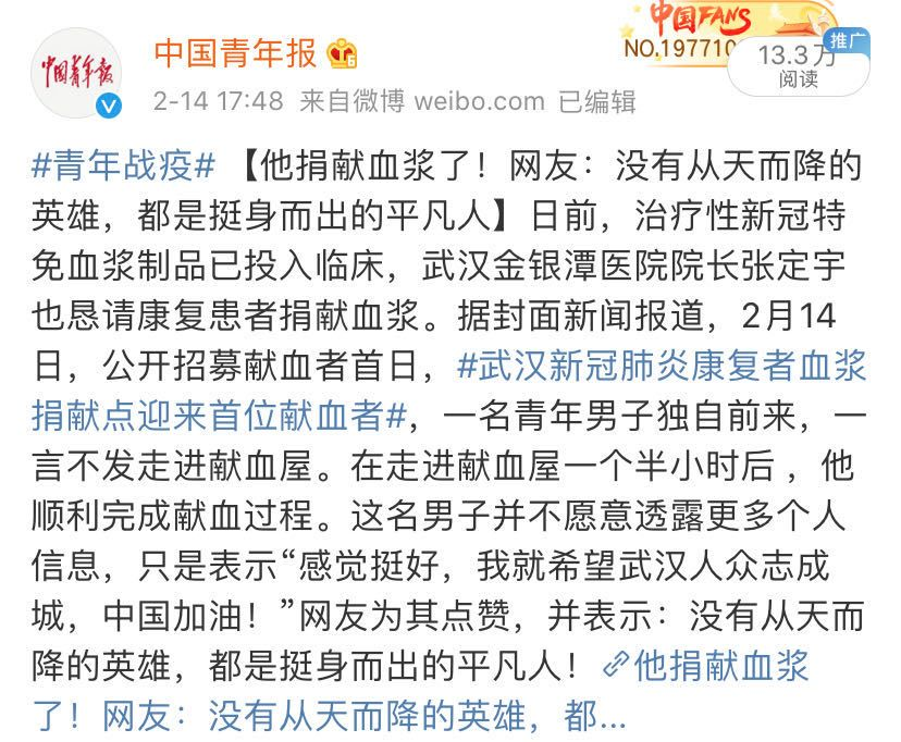 很快,”19名康復(fù)醫(yī)護(hù)人員捐血漿”的消息在網(wǎng)上引發(fā)熱議,不少網(wǎng)友被此感動(dòng)......