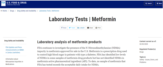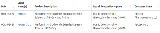 5月28日,F(xiàn)DA宣布,一些2型糖尿病降糖藥物二甲雙胍緩釋制劑中的可致癌亞硝胺雜質(zhì)——N-亞硝基二甲胺(NDMA)含量超標(biāo),F(xiàn)DA正與5家制藥公司聯(lián)系,建議其自愿召回產(chǎn)品,并在官網(wǎng)公示召回信息。另據(jù)知名網(wǎng)站fierce pharma,F(xiàn)DA發(fā)言人表示,F(xiàn)DA在二甲雙胍緩釋制劑中發(fā)現(xiàn)了致癌物質(zhì)污染,支持了Valisure實(shí)驗(yàn)室3月初的發(fā)現(xiàn)。